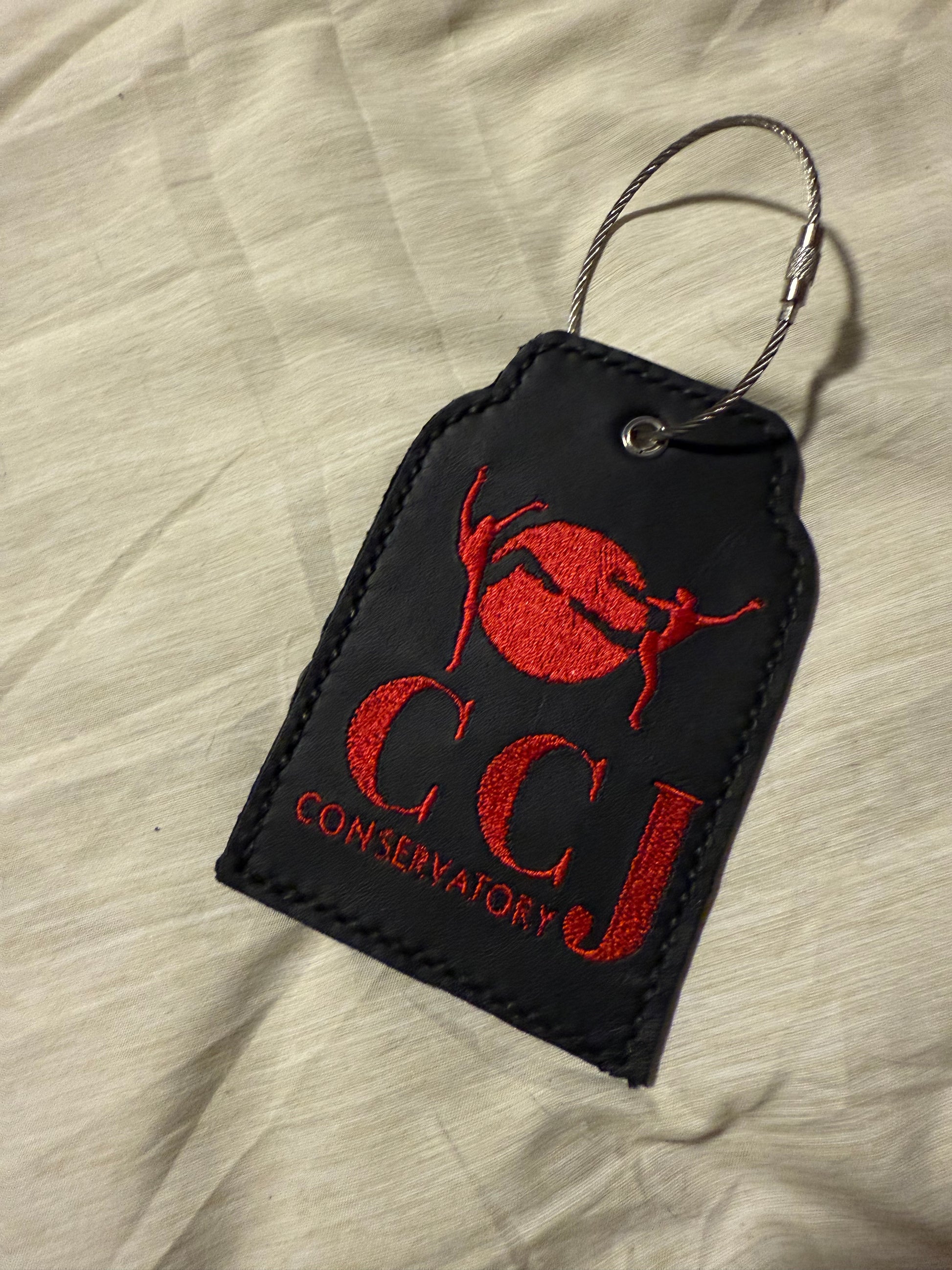 Custom CCJC bag tags for dance bags or luggage. Other leather/thread colors available on request.